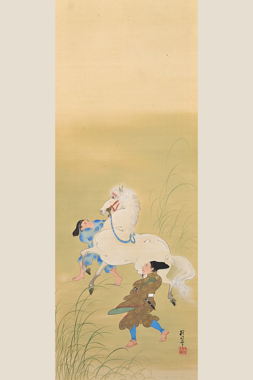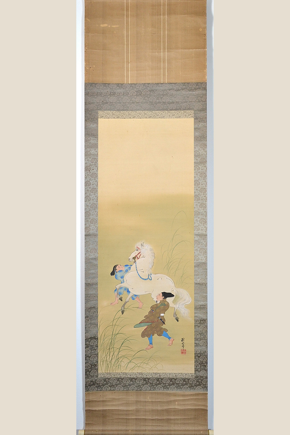 年の初めに白馬を見ると一年の邪気が祓われるという故事に由来する宮中の儀式。 21頭の白馬を天皇の御前に引き出し、天覧に供する行事で、その後は宴が催された。 *On the Meaning of the Painting Subject A court ritual originating from the tradition that seeing a white horse at the start of the year wards off evil spirits for the entire year.Twenty-one white horses were led before the Emperor for his viewing, after which a banquet was held. ・サイン「抱祝筆」、印「光琳専門道場」 |
