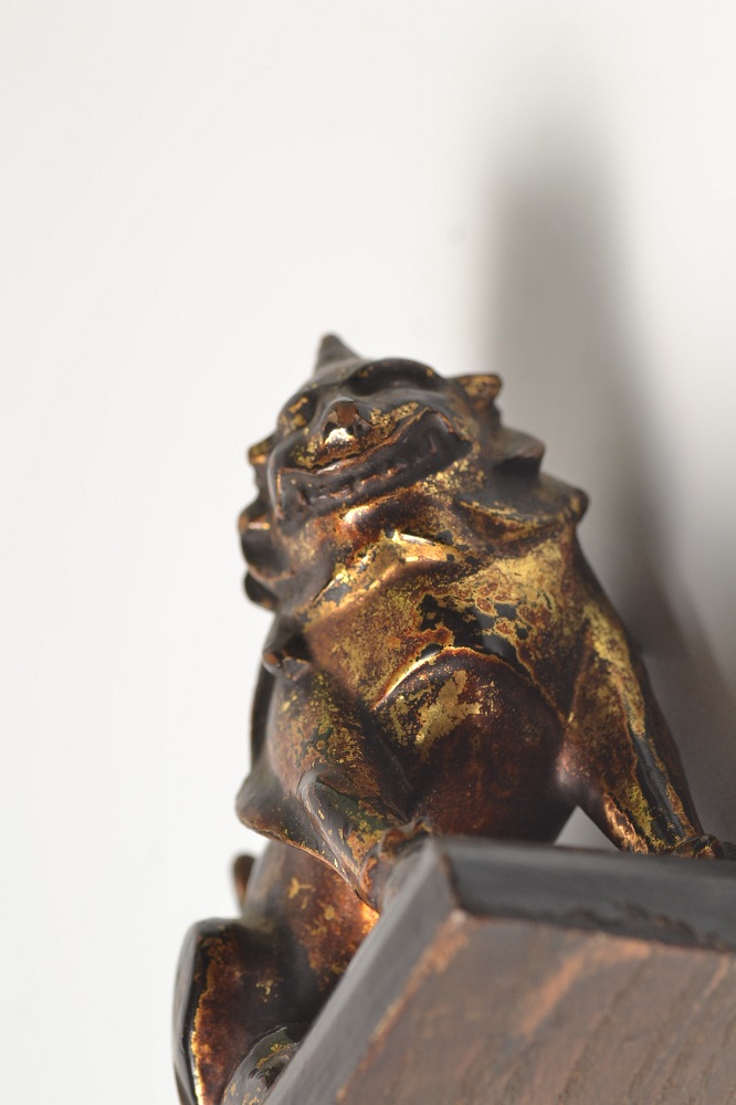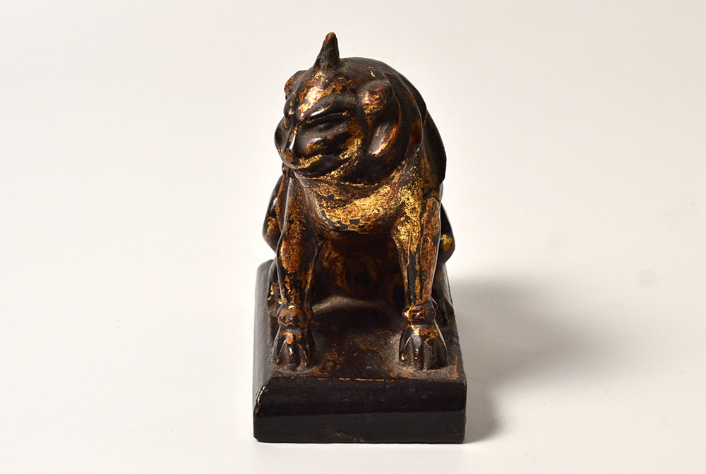 阿吽の形をした狛犬一対。 狛犬は口が開いているほうを「阿(あ)」、閉じているほうを「吽(うん)」といい、物事の最初と最後を示しているそうです。 300年以上の時を経た今も金彩が程よく残り、時代を経たものにしか出せない空気を纏っています。 所々漆が剥がれ木地が見えている箇所や擦れが御座いますが大きな欠損は無く美しい状態を保っています。 台座にも僅かに金彩が残ります。 A pair of komainu (guardian dogs) in the shape of A-Un. The open mouth of the guardian dogs is called “A” and the closed mouth is called “Un,” indicating the beginning and the end of things. The gold color remains moderately even after more than 300 years, and the piece is clothed in an air that can only be produced by an object that has passed through the ages. The lacquer has peeled off in some places, revealing the wood, and there are some scuffs and scratches, but there are no major defects and the object remains in beautiful condition. The base also has a small amount of gilding. |