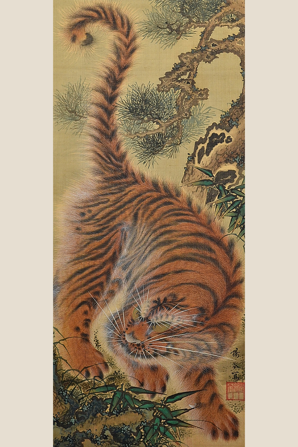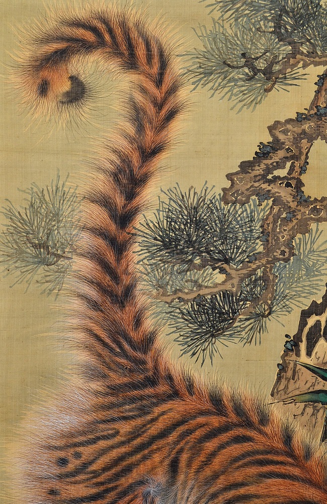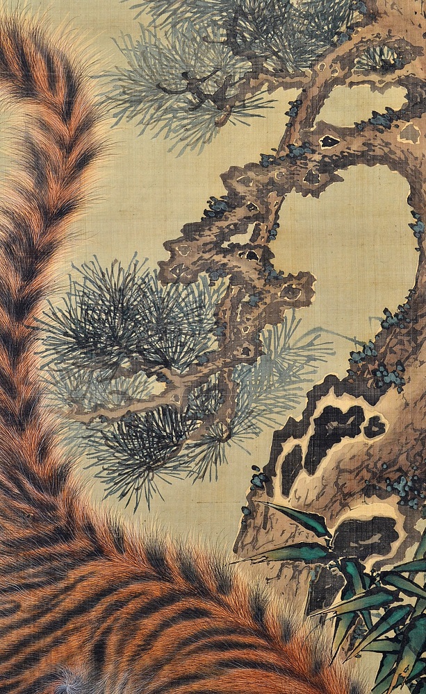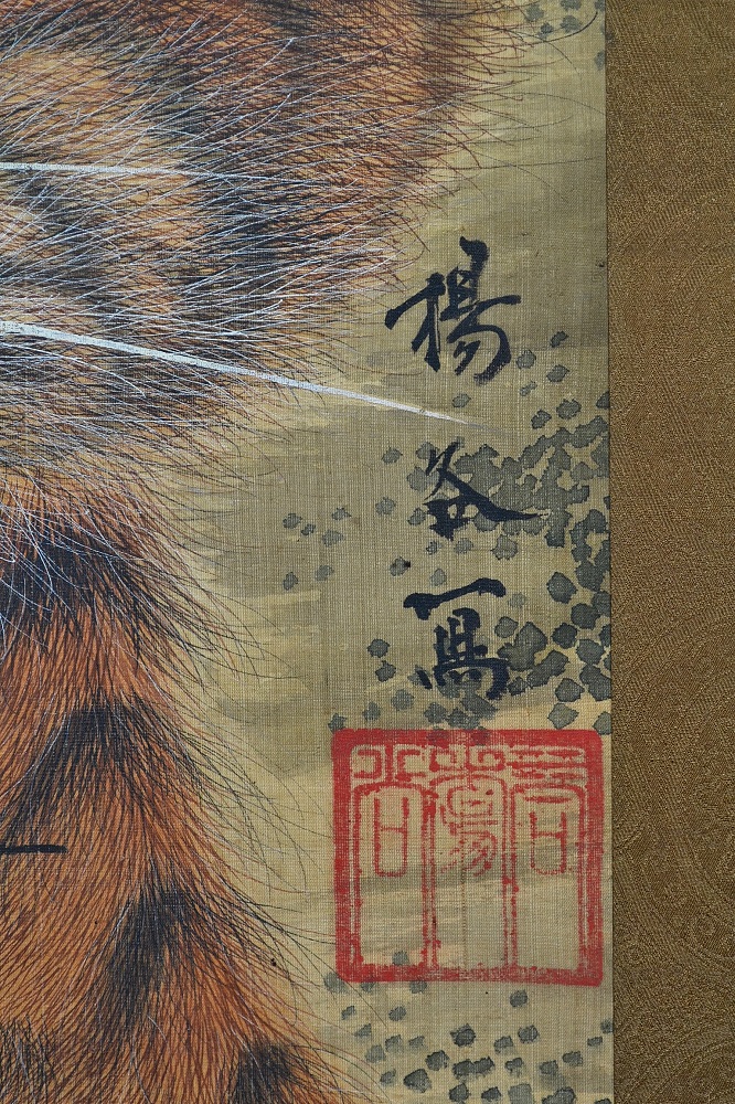 【片山楊谷(1760~1801)】 長崎出身。 幼少期に父を亡くし、1772(安永元)年13歳の頃故郷を離れ、絵筆を携えて諸国を遊歴したと伝わる。 17歳で鳥取の興禅寺に逗留して絵を描き、結婚。 若桜藩主・池田定常の計らいで茶道役の片山宗把の家に夫婦とも養子となり家督を継いだ。 その後も京都や兵庫を遊歴、寛政7年には妙法院真仁法親王、また光格天皇に召されて絵を描いた。 楊谷の画風は、隠元禅師(1592-1673)をはじめ黄檗宗とともに長崎へもたらされた中国趣味の強烈な色使いで、 清代の画人・沈南蘋(しんなんぴん, 1682-?)の写実技法や費漢源などに近いとされる。 特に虎の絵は、虎の毛を細い線で丹念に表し、応挙の柔らかな毛描きとは対照的な猛獣の固い毛が特徴。「楊谷の毛描き」と呼ばれている。 Painter. Born in Nagasaki and his paintings drew on the style developed in that town through contact with Chinese artists. Made extensive travels from the age of 13 onwards. By age 19 already had pupils; in 1792 he and his wife were adopted into the Katayama family in Tottori domain; in 1795 he received permission to travel to Kyoto, where he did a painting performance for Shinnin-hoshinno (abbot of Myoshinji and the emperor's younger brother) and was invited to imperial palace; in 1800 produced sliding door paintings for Sanro-ji temple in Harima but died suddenly at the nearby Yumura hot springs. |
