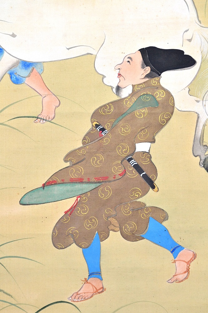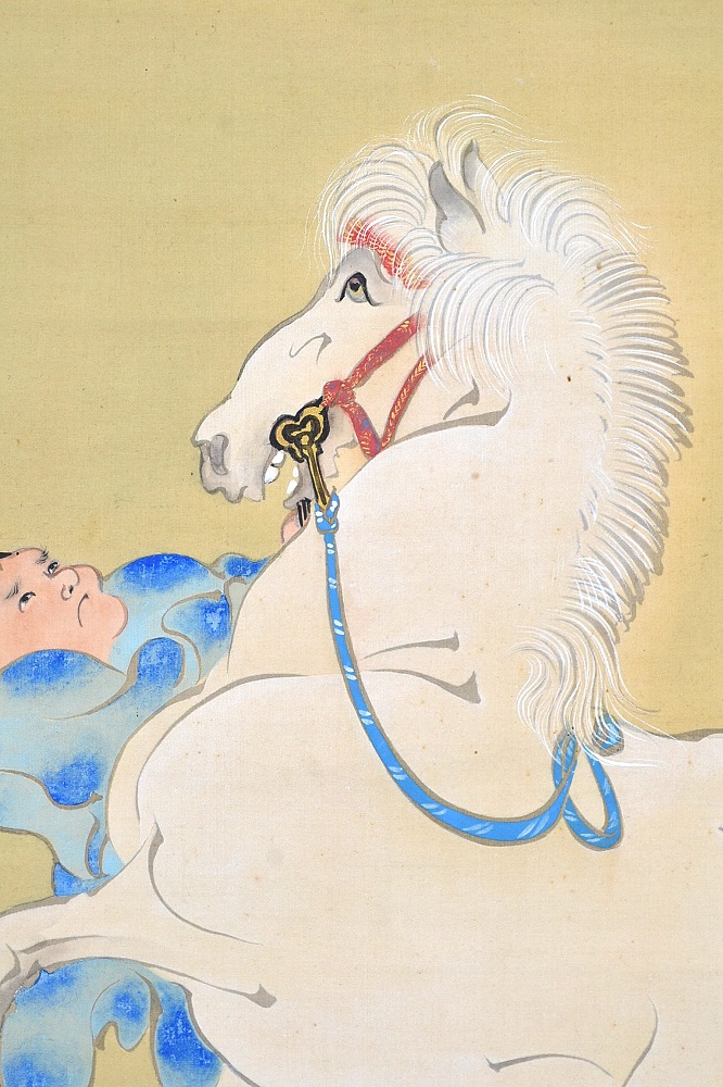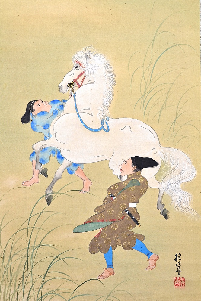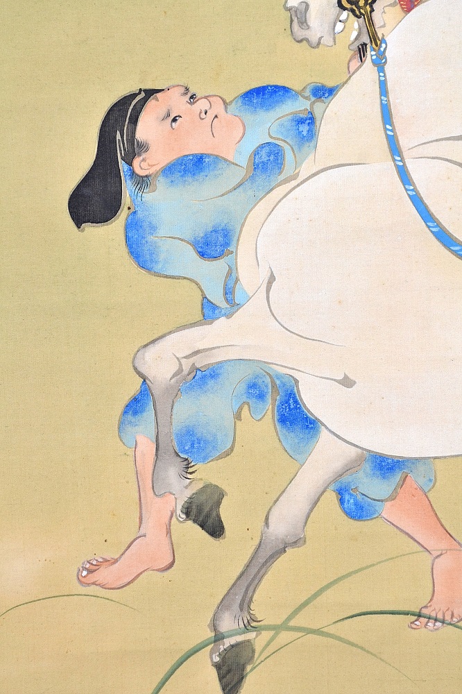 年の初めに白馬を見ると一年の邪気が祓われるという故事に由来する宮中の儀式。 21頭の白馬を天皇の御前に引き出し、天覧に供する行事で、その後は宴が催された。 *On the Meaning of the Painting Subject A court ritual originating from the tradition that seeing a white horse at the start of the year wards off evil spirits for the entire year.Twenty-one white horses were led before the Emperor for his viewing, after which a banquet was held. ・サイン「抱祝筆」、印「光琳専門道場」 |